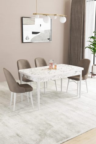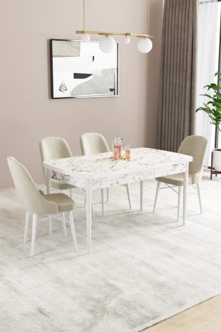 Almira Serisi, Beyaz Mermer Desen 80×132 Açılabilir Mdf Mutfak Masası Takımı 4 Adet Sandalye